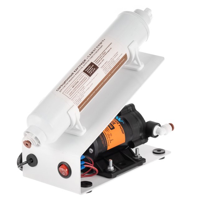 Фильтр Самогоныч состоит из картриджа, помпы, кнопки включения, блока питания, расположенных на металлической скобе.