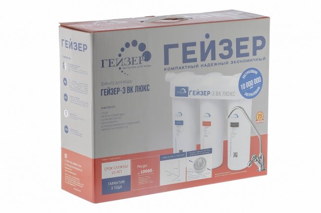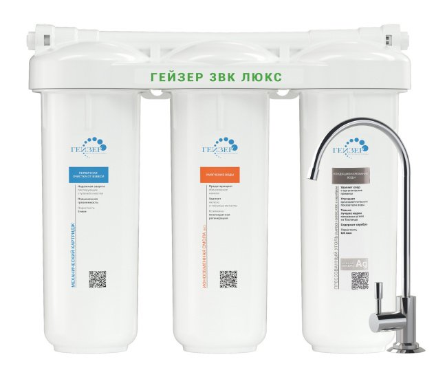 Экономичный трехступенчатый фильтр Гейзер-3 для жесткой воды представляет собой небольшое устройство со стандартной схемой фильтрации воды с увеличенным ресурсом по удалению тяжелых металлов, железа, хлора и органических примесей. Имеет достаточно небольшой, компактный размер. Поставляется в комплекте с краном №3.