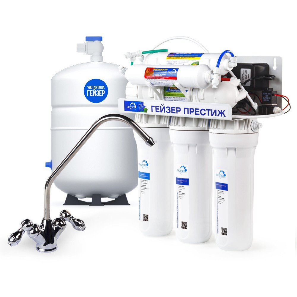 Технология обратного осмоса, использованная в фильтре Гейзер Престиж, заключается в фильтрации воды через полупроницаемую мембрану. Размеры пор мембраны настолько малы, что пропускают только молекулы воды. Размер молекул большинства примесей, а также бактерий и вирусов значительно больше молекул входящее в комплект, повысит уровень давления до 3-6 атм.